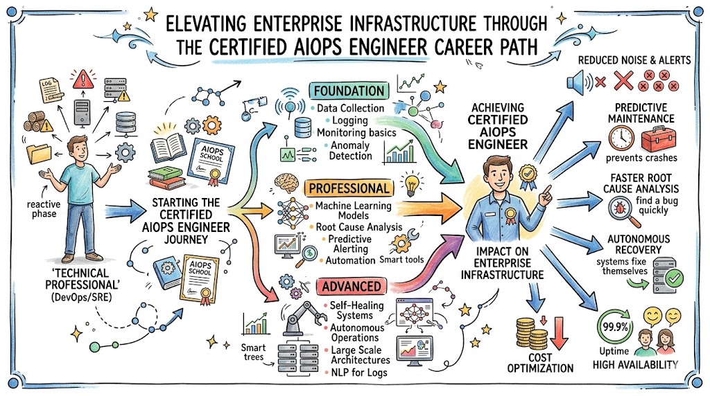 AIOpsSchool hosts and delivers this program via Certified AIOps Engineer. The curriculum guides students from core concepts to elite engineering by focusing on actual telemetry data. You face a mix of knowledge tests and performance-based labs that verify your ability to handle real-world datasets. This tiered structure ensures you maintain full ownership of a flexible yet demanding learning path.