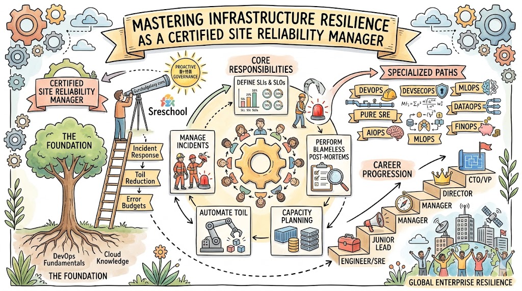 Technical leaders today face the massive challenge of maintaining system stability while accelerating software delivery, which makes the Certified Site Reliability Manager a vital asset for any modern enterprise. This comprehensive guide outlines the strategic path for senior engineers and managers who want to master the intersection of high-level business goals and technical reliability. By following the curriculum provided by Sreschool, professionals transform from reactive firefighters into proactive architects of platform governance. We explore how these specialized credentials empower you to lead high-performing teams within the cloud-native ecosystem. This roadmap helps you navigate career-defining decisions while aligning your skills with global standards for scalability and uptime.
